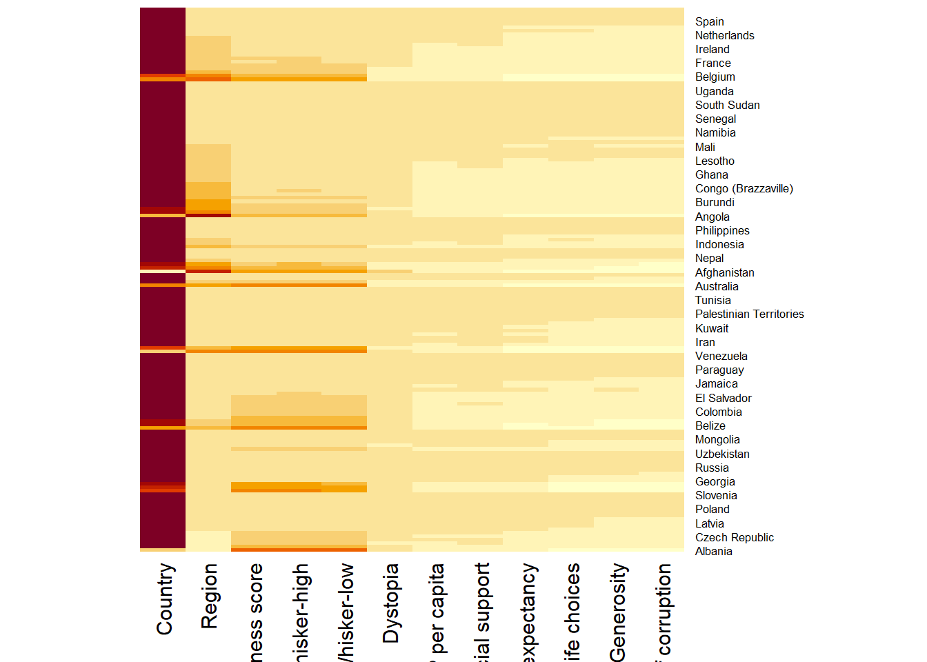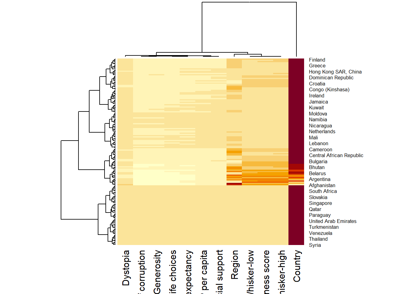 Here, red cells denote small values. This heatmap is not really informative. Indeed, the Happiness Score variable have relatively higher values, what makes that the other variables with small values all look the same. Thus, this matrix needs to be normalised. This is done using the scale argument. It can be applied to rows or to columns.