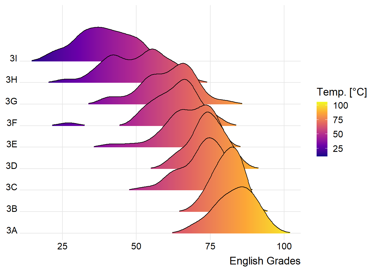 Sometimes we would like to have the area under a ridgeline not filled with a single solid color but rather with colors that vary in some form along the x axis.