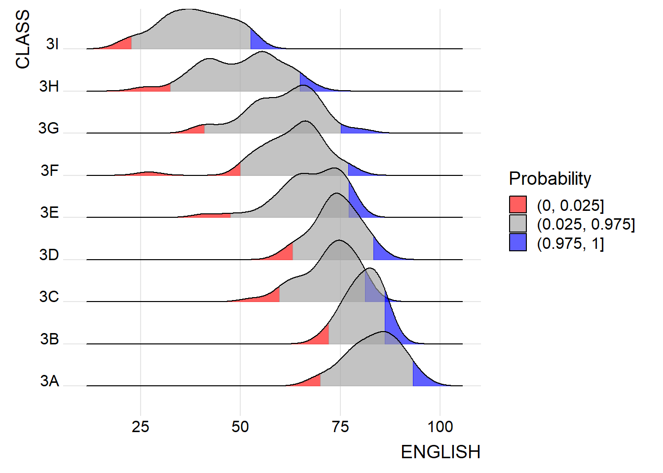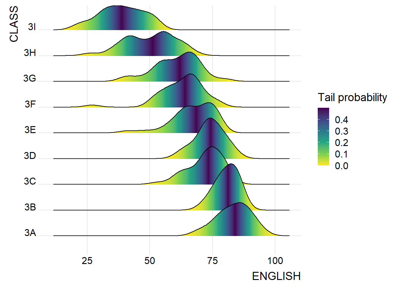Code chunk below shows a ridgelines plot of distribution of English score by class using geom_density_ridges()