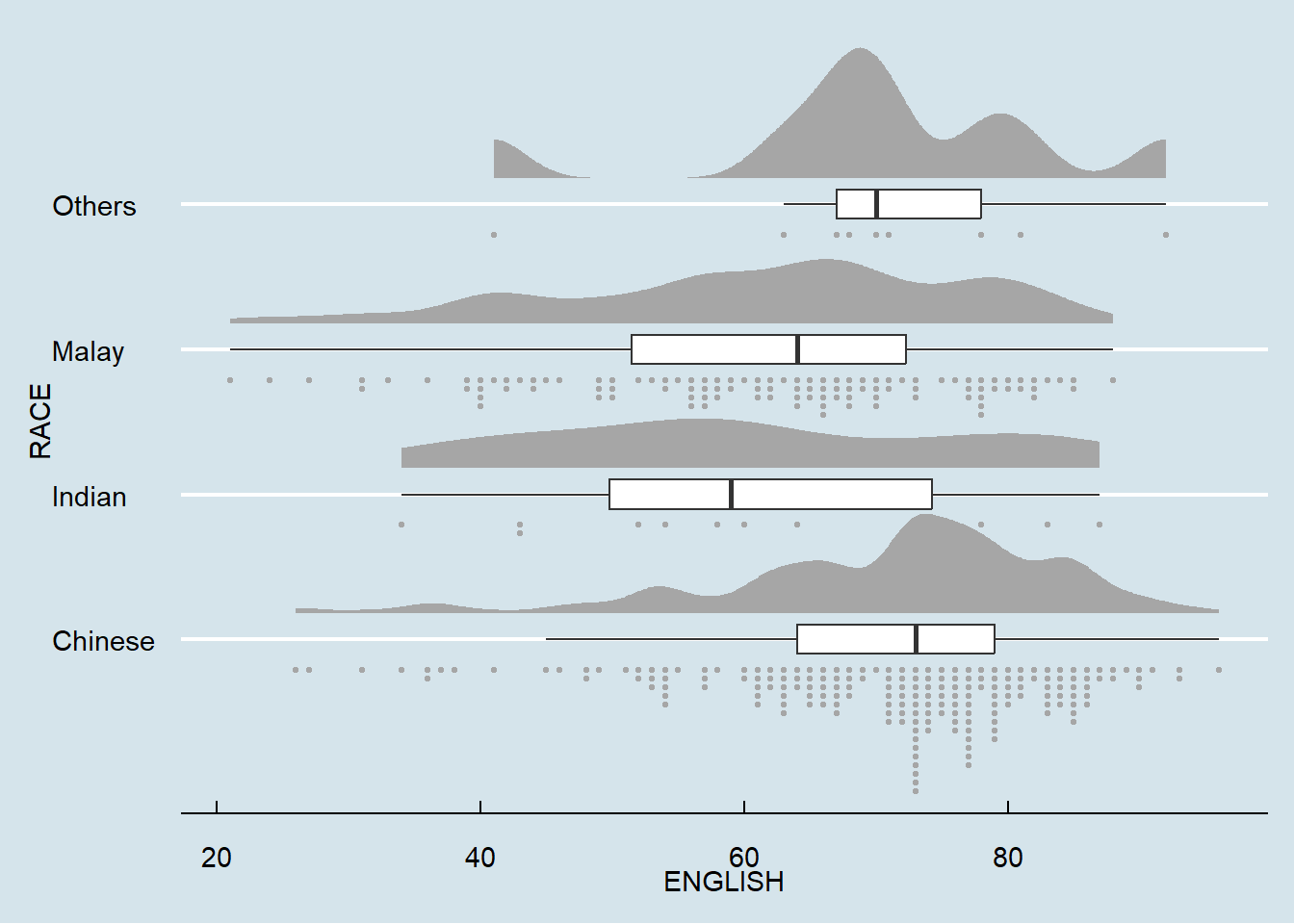 coord_flip() of ggplot2 package is used to flip the raincloud chart horizontally to give it the raincloud appearance. theme_economist() of ggthemes package is also used to give the raincloud chart a professional publishing standard look.