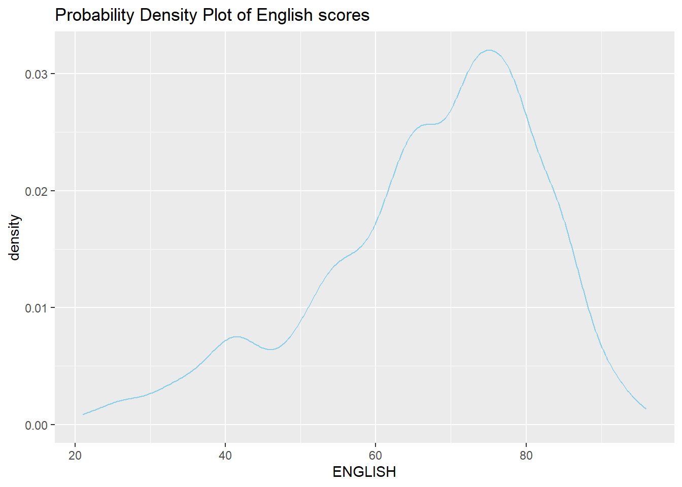 ggtitle("Distribution of English scores")Probability Density Plot