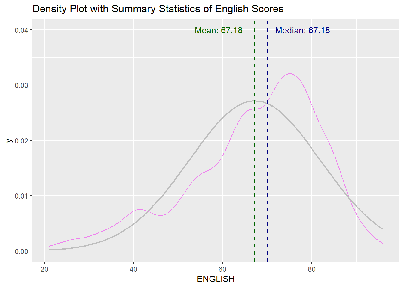 ggtitle("Probability Density Plot of English scores")Density Plot with Summary Statistics
